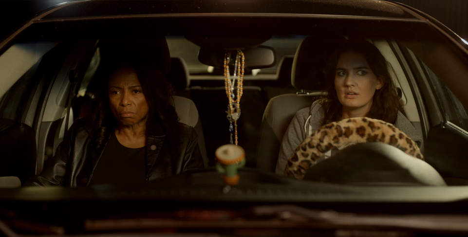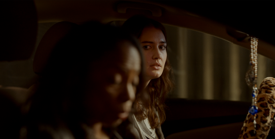 Stars of the short film Patty (Jia Gaye) and Taylor (Peyton Delwig) review lines on set before filming begins during the night shoot.